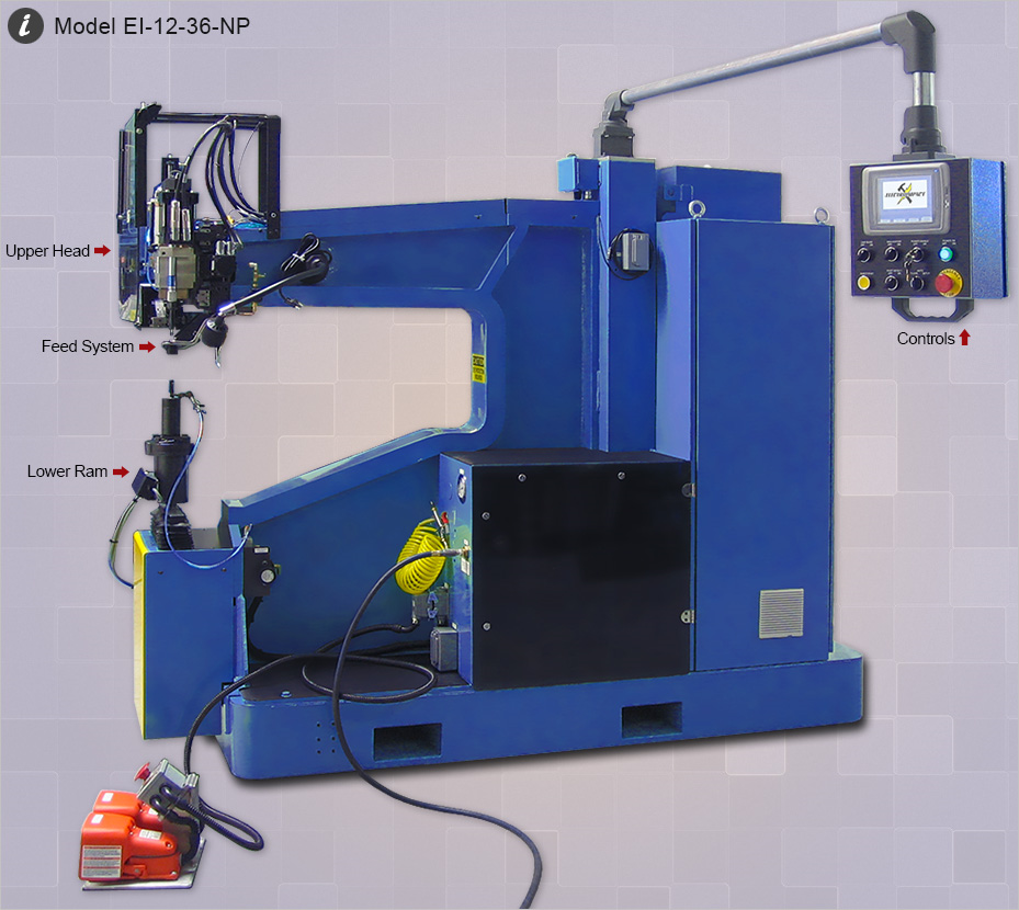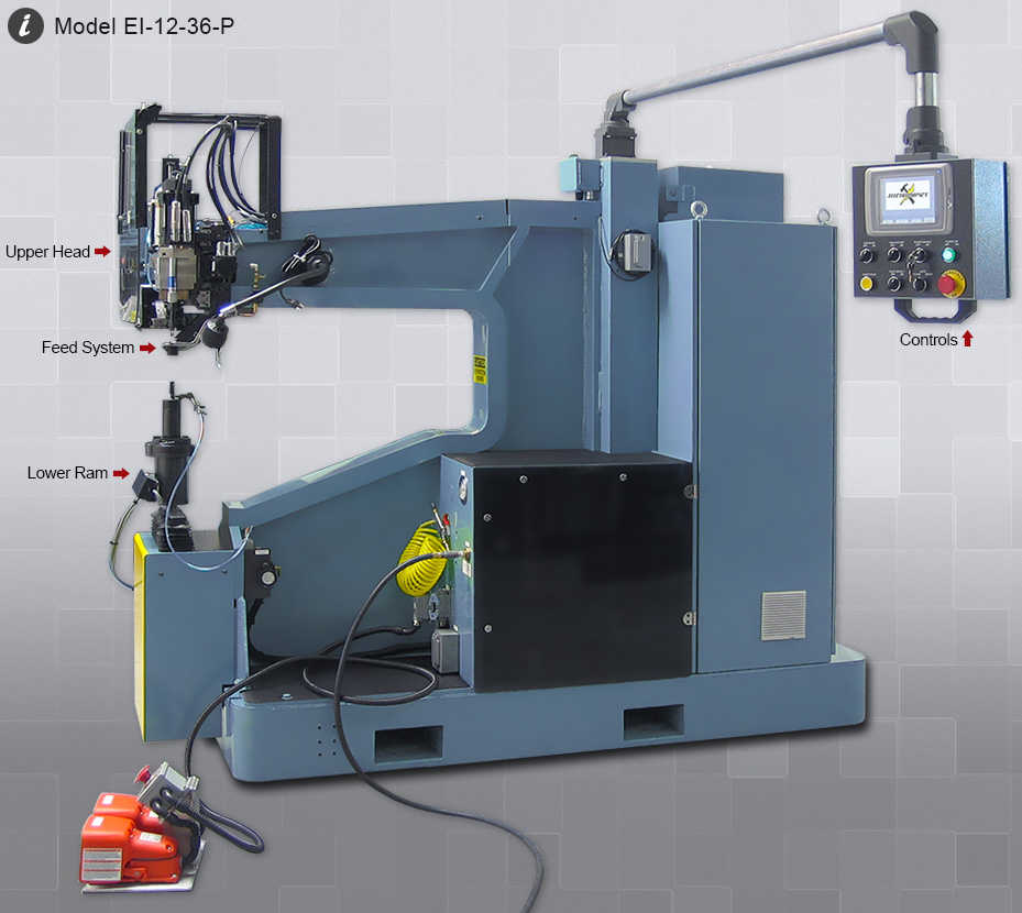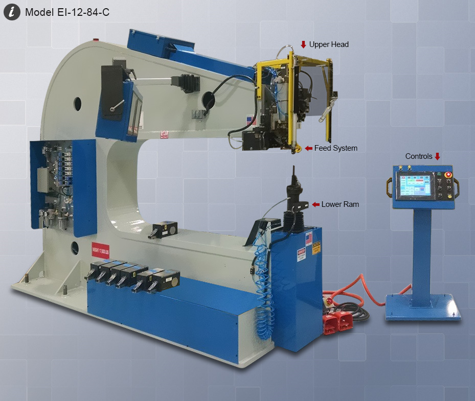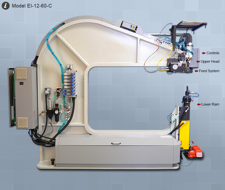 EI C-Frame riveters are available in Portable and Stationary configurations with Nut Plate instillation capability and Leading Edge Dual Ram (Knee) style automatic fastening systems.